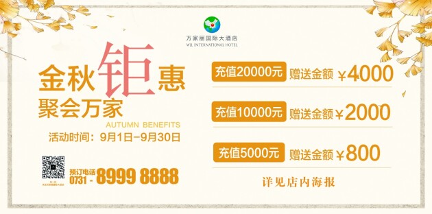 喜迎国庆,欢度十一。时值家人团聚节假日,出行首选万家丽。万家丽国际大酒店是神仙下凡度假村,为消费者提供七星设计五星收费的高品质节假放心生活,结合吃喝玩乐购一站式体验,给消费者省心、放心、开心的黄金假日。9月1日至9月30日,充值享优惠,充20000元送4000元,充10000元送2000元,充5000元送800元,即可享豪华套房免费升级券、延迟退房券、套房免费升级券等礼遇。(以上充值,客房餐饮皆可使用,与官微活动同享,除特价活动外客房享受国际卡政策,餐饮普通8.8折)