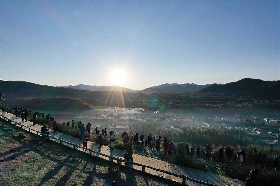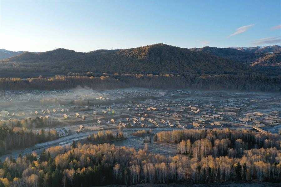 9月28日,游客观赏禾木秋景(无人机照片)。
