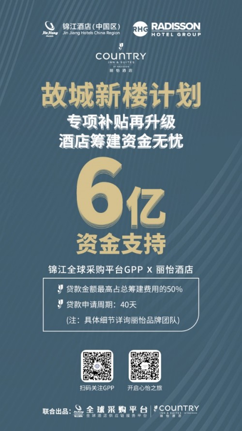 此次升级版的“故城新楼计划”中,针对酒店投资者现金流紧张的实际情况,丽怡酒店联合锦江全球采购平台(GPP)推出6亿元的专项金融服务政策,用于酒店在筹建和升级改造阶段进行装修和筹建施工。其中,贷款金额最高可占总筹建和升级改造施工费用的50%。