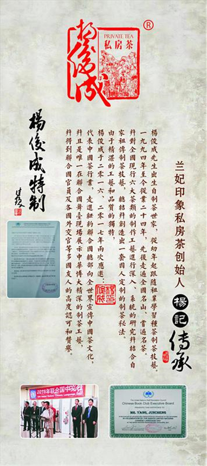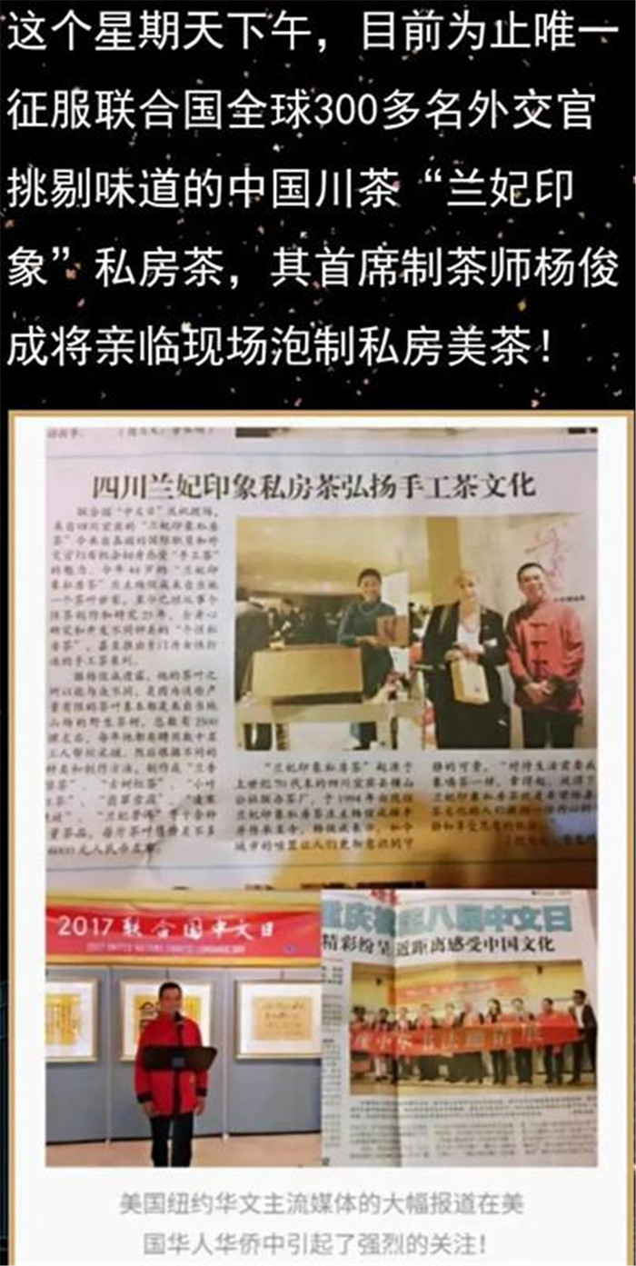 连续两次受邀前往纽约联合国总部现场制茶并被联合国两次授予唯一指定茶礼的川茶品牌兰妃印象私房茶,回国后不仅声名大振,在业界引起了巨大轰动,在全球范围内也拥有了数不清的拥趸。在成都的制茶工作室里,兰妃印象私房茶创始人杨俊成还迎来了来自法国、意大利、德国等国家前来拜师学艺的若干国际友人们。2018年,杨俊成第三次得到了联合国的独家邀请,目前,这在全世界都是唯一的一个案例!