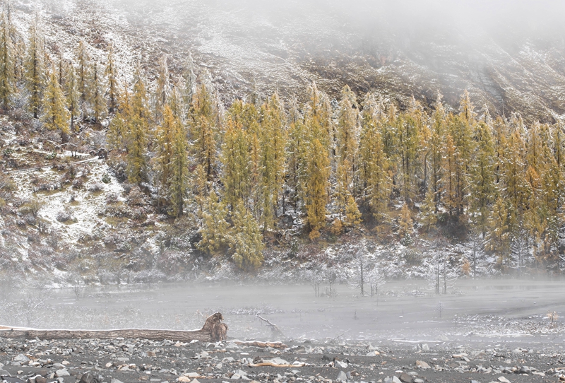 这是10月21日在玛嘉沟拍摄的白雪和雾气掩映下的彩林。