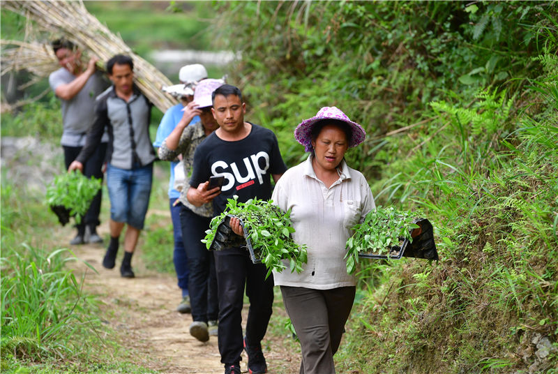 在广西融水苗族自治县同练瑶族乡如劳村,合作社的村民准备种植中药材(5月12日摄)。