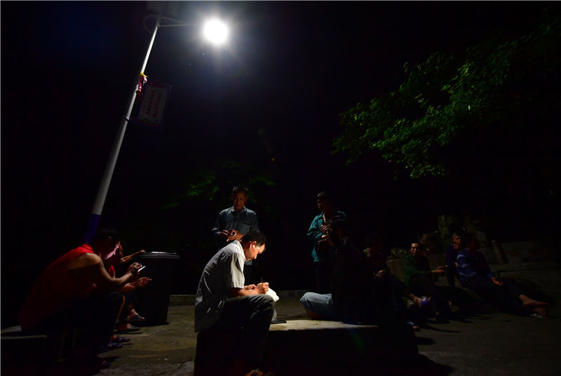 在广西融水苗族自治县杆洞乡党鸠村,村支书梁成张(前)在路灯下工作(5月13日摄,无人机照片)。