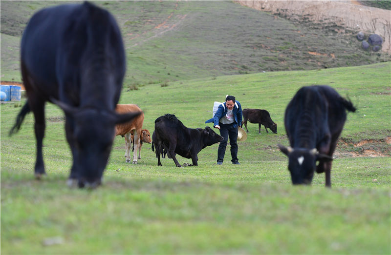在广西融水苗族自治县杆洞乡尧告村高山天然牧场,驻村脱贫攻坚工作队员李义成在了解牛的生长情况(4月26日摄)。