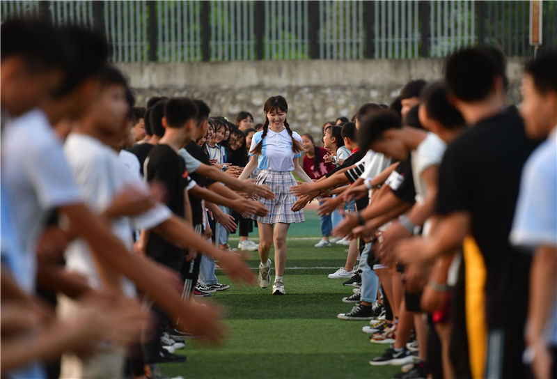 在融水苗族自治县思源实验学校举办的支教团送别晚会上,支教老师高洁(中)接受同学们的祝福(7月22日摄)。