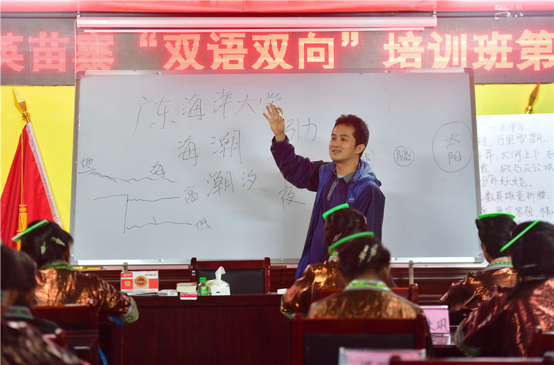在广西融水苗族自治县杆洞乡党鸠村乌英苗寨,广东海洋大学教授陈涛在给夜校班的妇女们上课(10月16日摄)。
