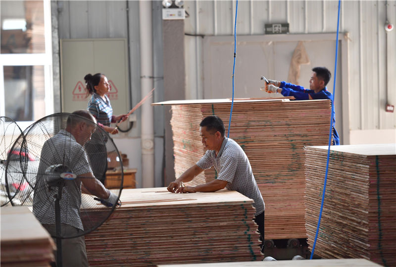 在融水苗族自治县粤桂扶贫协作产业园一家木业公司的巾帼扶贫车间,工人在生产线上作业(2019年8月25日摄)。