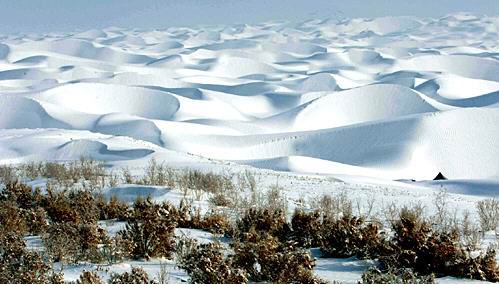 2008年,塔克拉玛干沙漠曾连续11天遭遇罕见的大雪,这是其有记载以来的最大幅度的降雪和低温天气。沙漠地区降雪是比较罕见的,因此白雪皑皑的塔克拉玛干沙漠也成就了一副壮丽的雪地沙漠美景。