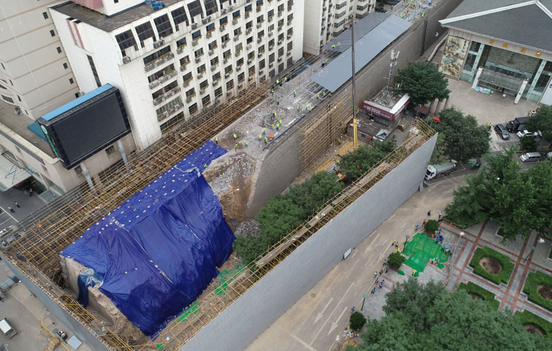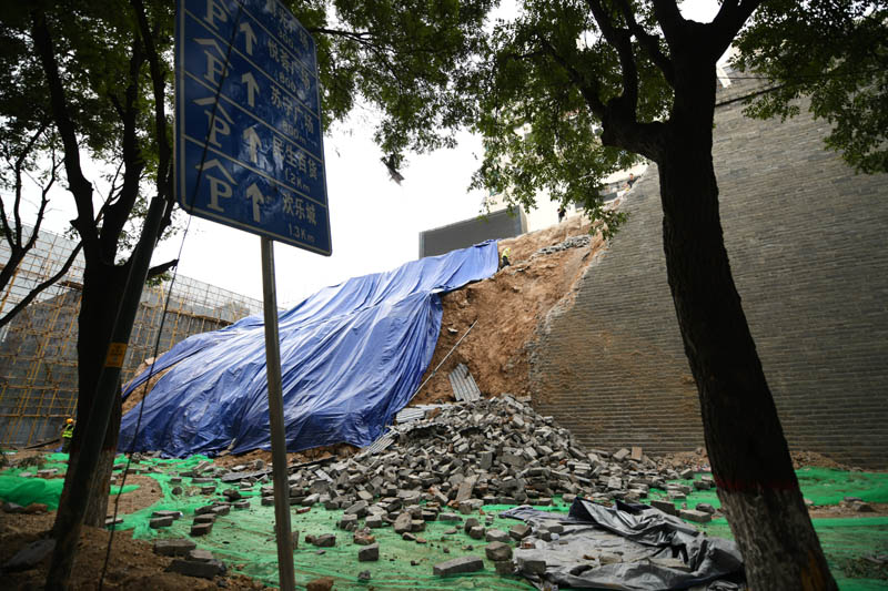 8月11日,西安市古代建筑工程公司的工人在明秦王府城墙遗址坍塌区域清理坍塌土体和砌块。