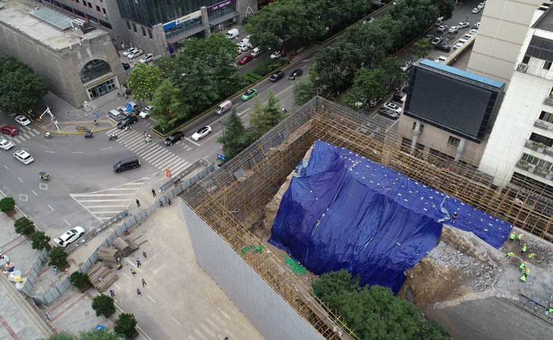 8月11日,西安市古代建筑工程公司的工人在明秦王府城墙遗址坍塌区域铺设防雨布。