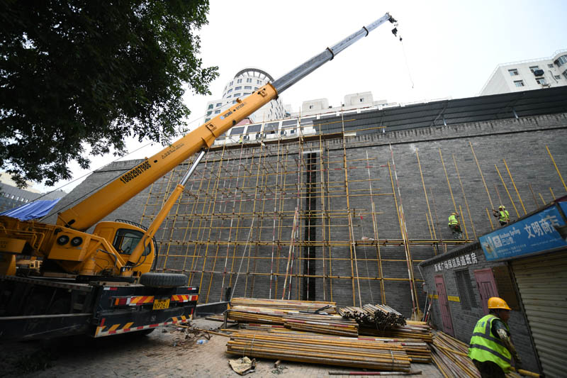 8月11日,西安市古代建筑工程公司的工人在明秦王府城墙遗址坍塌区域搭建脚手架。