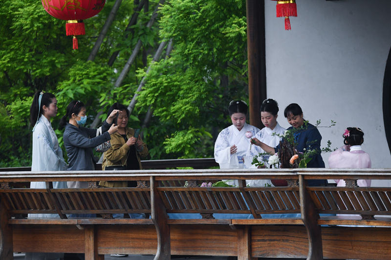 4月30日,参加宋韵文化体验的市民身着传统服饰,观看古琴表演。