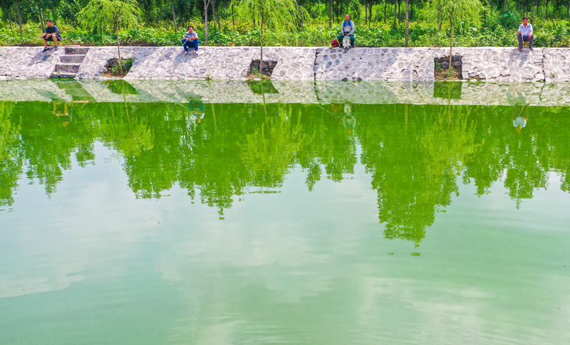 河北大城县南赵扶镇中赵扶村村民在处理后的生活污水蓄水池边钓鱼(8月9日摄,无人机照片)。