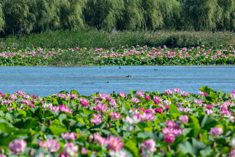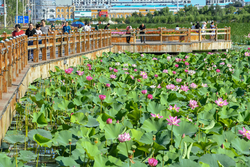 近日,位于吉林省白城市镇赉县的镇赉环城国家湿地公园荷花进入盛放期,吸引市民前来观赏。公园湖泡原址是县城污水排放点,水质富营养化,污染较为严重,2013年起,镇赉县先后实施了湖泡连通、湿地清淤、围堰保护、水污染综合治理、植被恢复等生态保护工程,使湿地公园成为了集城市生态治理、环保科普教育、市民休闲娱乐于一体的生态功能区。
