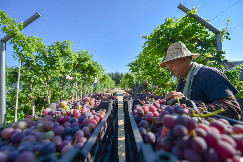 近日,天津市宝坻区民盛种养殖专业合作社里的葡萄丰收,进入采摘季。新冠肺炎疫情期间,合作社利用网络渠道积极开展互联网无接触配送业务,业务辐射京津冀地区以及广东、海南等地。