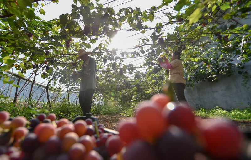 近日,天津市宝坻区民盛种养殖专业合作社里的葡萄丰收,进入采摘季。新冠肺炎疫情期间,合作社利用网络渠道积极开展互联网无接触配送业务,业务辐射京津冀地区以及广东、海南等地。新华社发(孙凡越 摄)