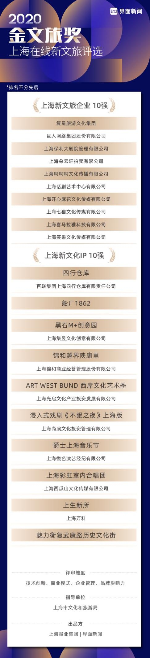此次2020“金文旅奖——上海在线新文旅评选” 由上海报业集团|界面新闻主办,借由奖项评选与论坛交流,帮助企业把准新时期文旅产业发展脉搏,率先触碰先进经验与前沿模式,从而在未来实践中集中积累发展动能,探索创新解决方案,打造更富竞争力的在线文旅发展模式。通过前期调研与信息检索,结合天眼查数据筛查以及企业舆情分析,并经由学术、业界专家评定,评选出10家优秀文旅企业与10项优秀文旅地标/IP。最终榜单如下: