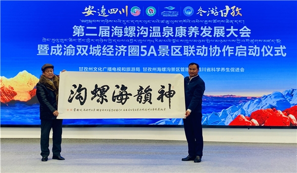 会议首先播放《一路向“冬”》《冰雪恋歌》等暖场视频,甘孜州委常委、州人民政府副州长李兴文致辞;桑子冰授予海螺沟景区“四川康养旅游示范基地”牌匾,海螺沟景区党委书记、管理局局长文明接牌;著名书法家冯晚榆向海螺沟景区赠送书画作品;海螺沟、峨眉山、碧峰峡、仙女山、金佛山等五大川渝5A景区代表在会上签订了《共建成渝双城经济圈5A景区联动合作协议》,并启动联动协作机制。