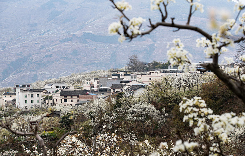 3月5日,在汉源县九襄镇大田村,雪白的梨花和当地民居相互映衬。