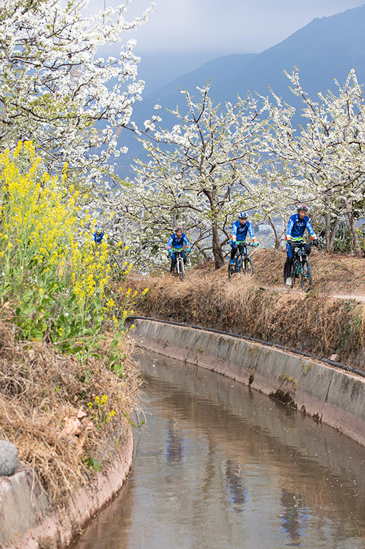 3月5日,在汉源县九襄镇大田村,当地骑行爱好者沿着东大堰在花丛中骑行。