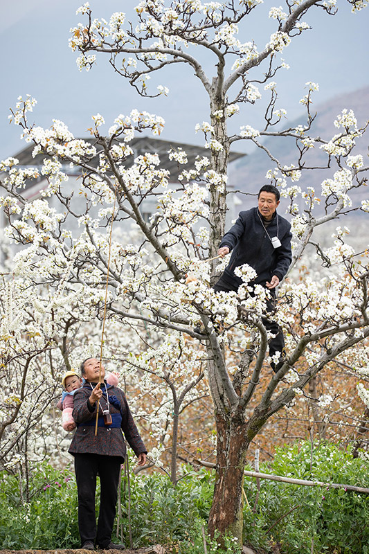 3月5日,汉源县九襄镇后山村村民给梨花人工授粉。九襄镇梨树以金花梨为主,金花梨属于虫媒花,需要异花授粉。通过长期实践,九襄镇的果农摸索出一套用鸭梨花为金花梨人工授粉的方法,使梨的坐果率提高1到5倍。