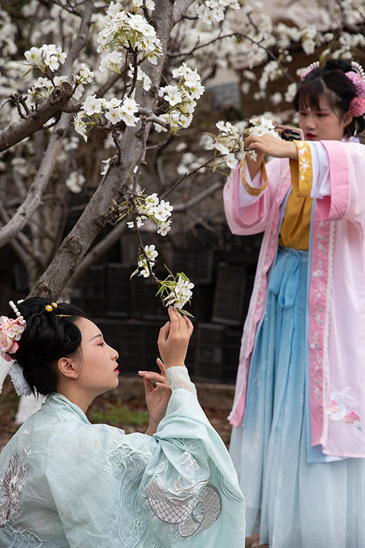 3月6日,在汉源县九襄镇三强村,来自成都的汉服爱好者在梨花林里留影。