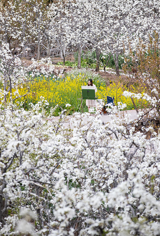 3月5日,在汉源县九襄镇大田村,当地小学老师、油画爱好者周玲伊在花丛中写生。