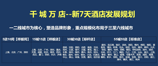 2021年4月30日,7天酒店“千城万店”将在北上广深四大超级城市完成5店10个样板间布局,在15个一线及新一线城市布局15个样板店,在30个二线城市布局30家标杆店,在55个三至六线城市布局55个标准店。实现7天酒店升级计划的全国性战略部署。