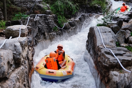 据了解,乐谷银滩高山漂流被称为“天子脚下第一漂”,是京西地区最受游客欢迎的夏季打卡项目之一,每一个来这里的游客都要下水体验一把。这里的漂流里程全长3.8公里,从起点到终点的落差达到180米,每一段都惊险无比,数十个急速叠落的水道,让人惊恐又倍感刺激,坐在皮艇里,人随艇飞,随水流的变化而旋转、倾斜,或匀速漂行,或过山车般急速起伏。