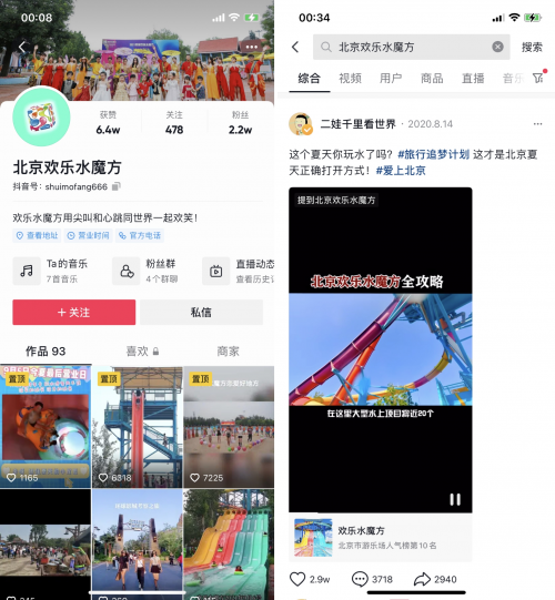 “流量在哪儿,生意就在哪儿”,关注到了抖音强大的流量聚集作用,欢乐水魔方随即开启了在抖音上的营销探索。2019年,北京欢乐水魔方开通官方抖音号,发布内容以景区特色项目展示为主,截至目前已有2.2万粉丝。同时,欢乐水魔方也邀请了一些北京本地达人打卡探店,通过直观生动的内容展现,以及达人的本地影响力,迅速提升了品牌声量。
