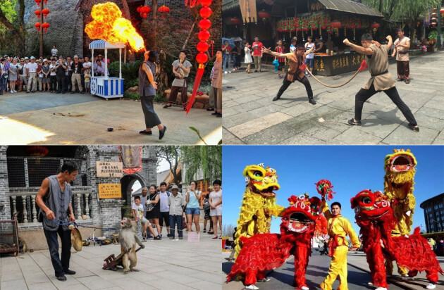 重现三国街头的市井杂耍表演,武术、杂技、非遗民俗齐上阵。千年非遗猴艺表演、传统民俗舞狮表演点燃热闹的街头氛围;民间高手大秀喷火、爬梯、上刀山、鼻子拉车等绝技,武术高手展示中国功夫绝活:铁头功、铁砂掌、铁布衫,他们在关圣古镇等着你的连连赞叹、惊喜尖叫!