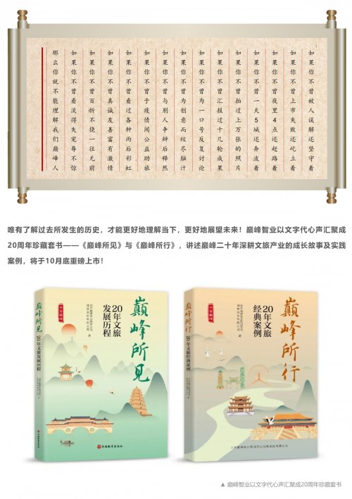 《巅峰所见:20 年文旅发展历程》是巅峰智业探寻中国旅游业发展的实践之路,以时间为线索,观察中国文旅行业的二十年变迁;以巅峰智业不断发展迭代的历程为脉络,搭建中国文旅产业创新开拓者的成长模型,向每一位文旅人、每一位读者讲述巅峰20年深耕文旅产业的故事,与君共勉。