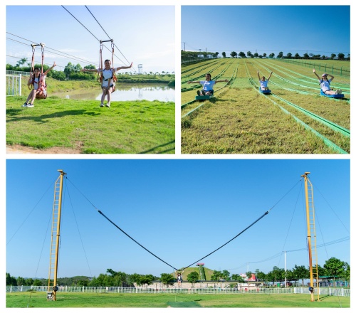据介绍,度假区已建设高空滑索、摇摆桥、人体弹弓、轨道滑草、履带鞋滑草、履带车滑草、四轮车滑草、彩虹旱雪滑道、七彩极速滑草、愤怒的小鸟、草地碰碰球、多人秋千、摩天轮秋千、网红树旋转秋千、6人排坐秋千、6人坐旋转单车、固定式滚筒、轨道滚筒、真人CS野战场、射箭场、激光打靶场、乐巴车、翻滚车、仓鼠球、儿童小坦克、蹦床等。