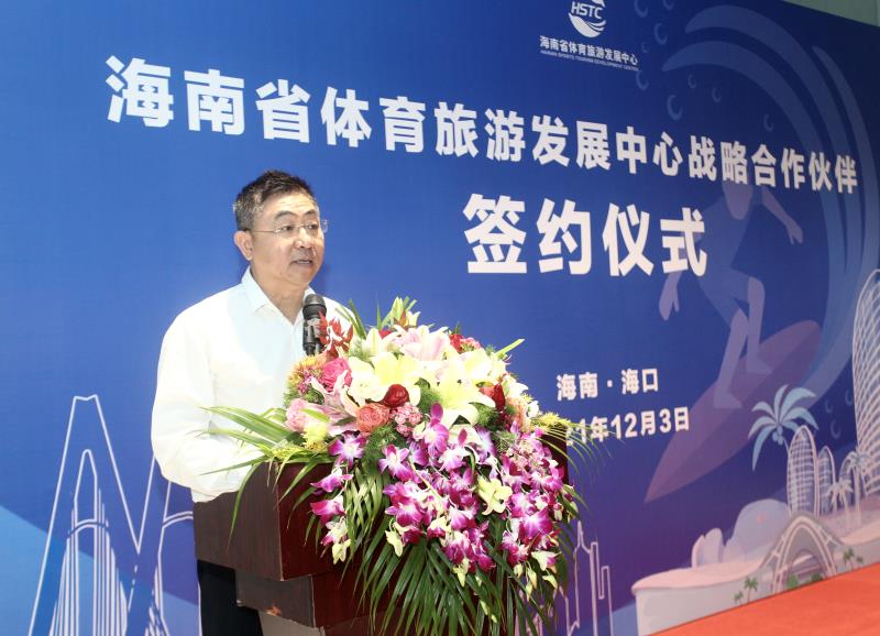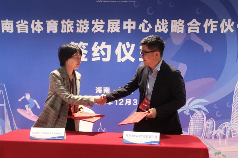 (图二:海南省体育旅游发展中心主任朱雷与国家体育总局文化发展中心活动部负责人芦潇签署战略合作协议)