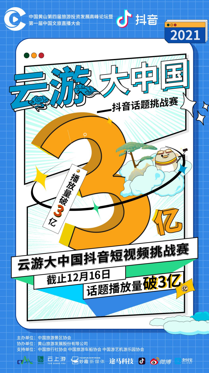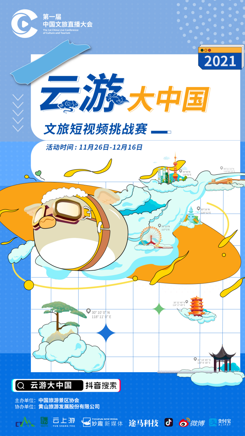 旅播傲江湖,云游大中国。11月26日,第一届中国文旅直播大会在线上启动,通过线上线下多平台联动。12月16日,第一届中国文旅直播大会完美收官。#云游大中国 抖音话题挑战赛自上线以来,话题播放量超3亿!