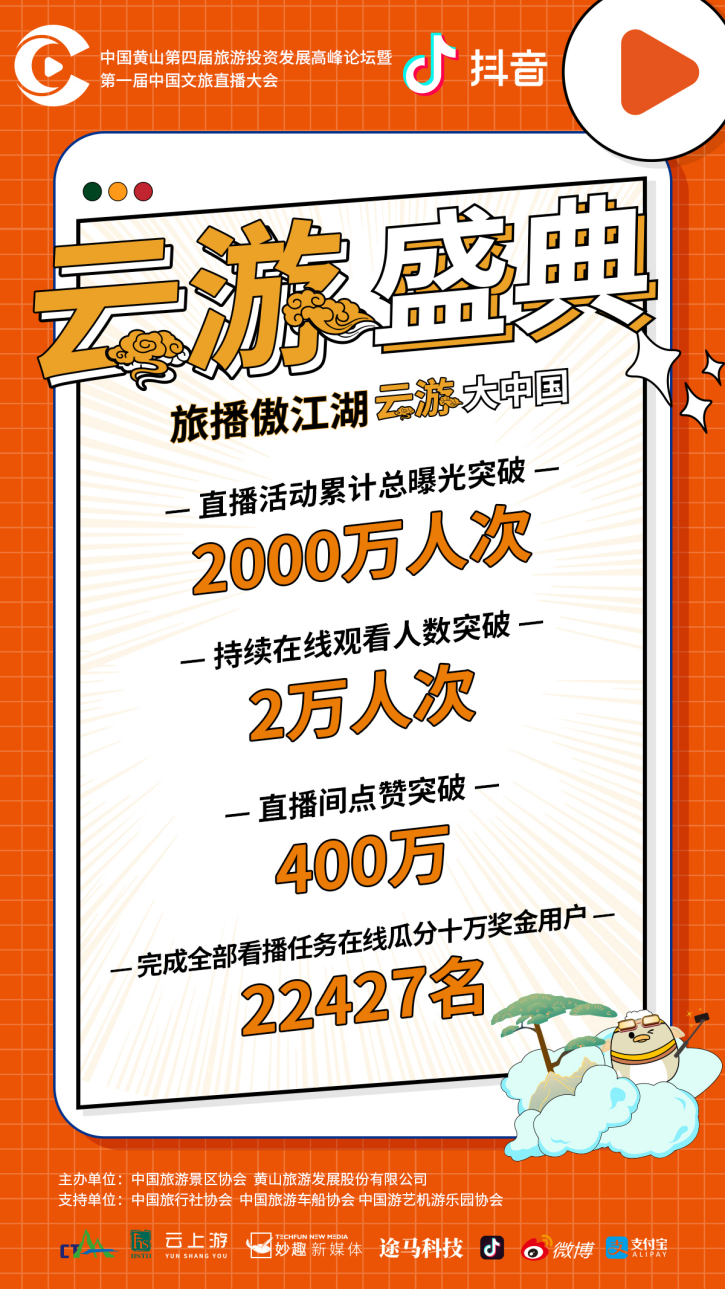 “云游盛典”直播活动累计总曝光突破2000万人次,持续在线观看人数突破2万人次,直播间点赞数突破400万,22427名抖音用户完成全部看播任务在线瓜分十万奖金。