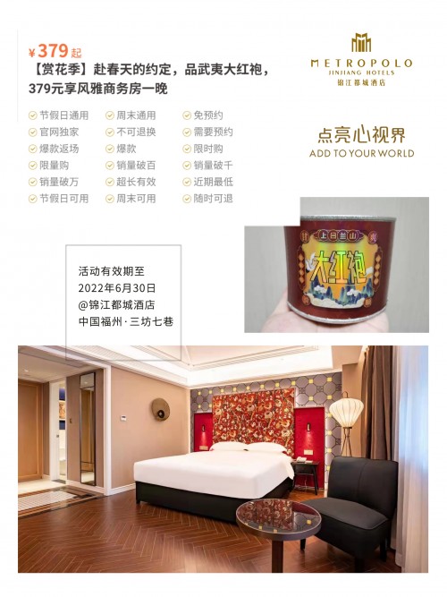 (即日起至2022年6月30日,酒店特推【赏花季】379元享原价539元的风雅商务房一间夜,另赠送大红袍一罐的酒店控超值打卡活动。了解更多可关注“锦江都城”或“锦江都城酒店”微信公众号。)