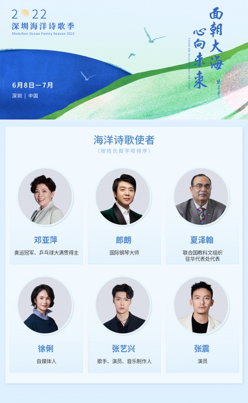 担任项目共同倡导者的还有——奥运冠军、乒乓球大满贯得主邓亚萍,国际钢琴大师郎朗,自媒体人徐俐,歌手及演员张艺兴,演员张震;谷川俊太郎、欧阳江河、黄礼孩、李元胜等四十余位中外诗人也应邀成为共同写诗人,号召全世界关注海洋、热爱诗歌的朋友们,一起参与到写诗、读诗中来。