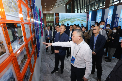 在颁奖典礼正式开始之前,参会领导、嘉宾和参赛团队一同观赏了「超 · 越 | 鉴湖新盛景」绍兴鉴湖概念规划与方案设计国际竞赛主题展览,展览集中呈现了竞赛的主题策划、重点概念、议程回顾和入围方案。