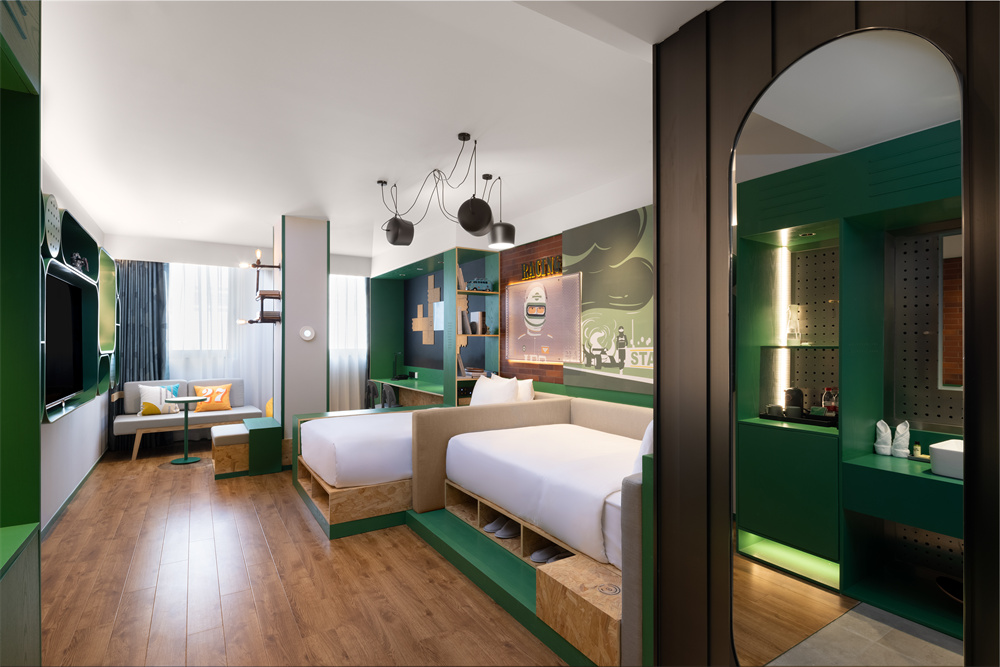 酒店不止于酒店,这里更像一个青创空间的品牌样本——自习研学+科研旅宿+创客沙龙+网红茶饮+Live house综合体。其核心体验亮点突出三点:一是,真正的大堂/公区革命,通过啤酒箱岛台、瑞境孵化巢、灵感梦工厂的巧妙设计,把“办公+生活”融入其中;二是,无论是“商旅短租”还是“创业/学习中长租”,多元化房型组合同时满足“高质量办公”的便利与“拎包入住”的实用;三是,24h补给站,为匹配年轻人作息习惯,陶瑞酒店提供独创了Z时代新型餐饮解决方案——集合活力早餐+下午茶+半自助酒水+零售餐饮于一体的智汇吧,全天候提供自助服务以及热销单品。