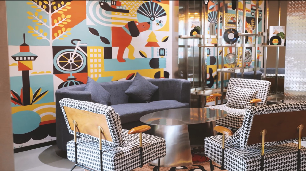 记者在探访中发现,整个酒店为了呼应“睿趣”这一品牌特色,在每个角落都花了小心思,将“共享生活、共享工作”的品牌理念年轻化、潮流化的呈现,以睿趣的创作理念,时尚的设计语言诠释酒店。同时运用摩登复古、潮玩IP、插画艺术、装置艺术和光影等元素,深入觅寻年轻前卫的设计美学和价值理念,把美学表现和城市人文灵感故事带入酒店空间,打造线上线下双向互动感知的共享生活和工作场景,不断让客人与酒店空间产生互动、情感满足和共鸣,创造新青年人群最睿趣的出行体验。例如,设置艺术妙趣横生,让等电梯不再乏味。