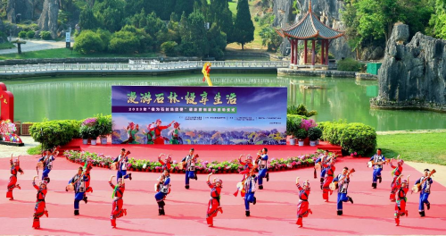 活动在精彩绝伦的表演中启幕,立即吸引了不少游客乡亲们迫不及待的前来拍照观看,舞台上披红戴绿载歌载舞,人群中摩肩接踵欢快熙攘,景区内草坪、鲜花、石峰、秀水、大三弦、彝家人,沉醉悠然,共享曼妙时光。悠闲安逸的旅途生活在石山岩海中弥漫,悠扬的旋律在阿诗玛的动人传说中起舞,大家尽情欢歌,畅快互动,来自全国各地的游客共同参与了这场亲切、热烈、惬意满满的精彩盛宴。