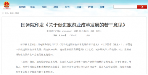 由国务院办公厅印发的《关于促进旅游业改革发展的若干意见》中指出,要大力发展推动体育旅游,加强竞赛表演、健身休闲与旅游活动的融合发展,支持和引导有条件的体育运动场所面向游客开展体育旅游服务。