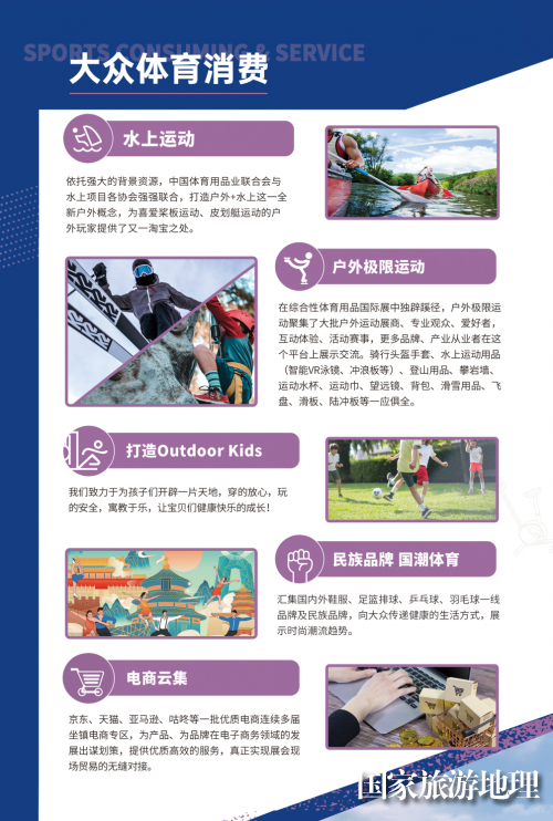 顾名思义,2023中国体博会体育消费及服务展区的内容设计侧重点在大众体育消费方式的呈现上,打造以下四大核心概念:水上运动、户外极限运动、民族品牌与国潮体育、电商体育消费等。
