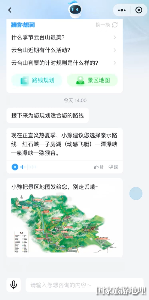 具体来说,景区导游导览大模型服务平台覆盖游客旅游前、中、后全流程不同阶段的各个场景,可以满足游客在行程规划、智能导览、互动体验等方面的旅游资讯需求,游客只需进入景区的官方小程序并点击“智能导游小豫”,即可向智能客服进行关于行程的询问。