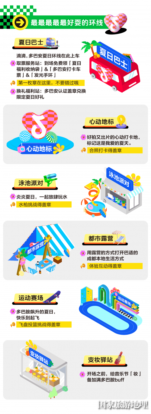进入园区领取“车票”登上「多巴安夏日巴士」,可以随心选择目的地。在这趟旅程中,不仅有好拍又出片的多巴胺色彩打卡点,还有让你享受度假氛围的“泳池派对”、能释放“野”趣的“都市露营”、瞬间激活好动细胞的“运动赛场”,以及免费收获音乐节限定妆容的“变妆体验”……多重场景自由切换,让你分分钟拥有“环游世界”的即视感。除了在环线上互动狂欢,参与游戏的同时也别忘了兑换诚意满满的伴手礼,重重惊喜福利让本就欢乐的旅程更加圆满。