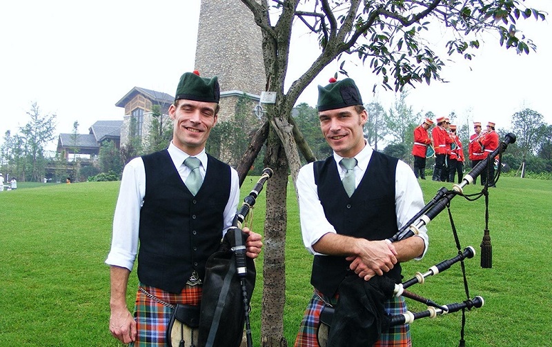 中心教堂是举行婚礼的热门场地,有这样一个传说,在教堂进行求婚的情侣一定能顺利,心想事成,而且婚后生活很幸福。恰好这一天,我在教堂门口就遇上了一场婚礼。新郎英俊帅气,新娘美丽大方,出席的嘉宾都盛装出席。如果不知道苏格兰传统的人,可能会很惊奇的发现,呀,好多男士都穿着裙子!其实苏格兰男士穿着裙子这件事,从十六世纪已经开始。在过去古老的年代,纺织造衣技术有限,苏格兰高地的天气寒冷,人们把没有裁剪过的布料用油浸透来防水,直接裹在身上,这样便可以抗拒潮冷的气候。那时候的人们用皮带在腰间固定这布料,穿在身上便是御寒的袍子,脱下来可以当毯子,实用性高,所以也就慢慢普及开来。到了十七世纪,苏格兰人觉得这个裙子穿起来真是非常威武雄壮,展现战斗民族的英勇气概,于是整个苏格兰刮起了一阵风潮,当然也从当初的笨重型改变成了如今简介短小精悍的样子。