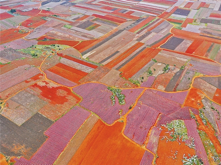 进入5月份以来,富源县中安街道石坝水库周边的浒子村吸引了众多的航拍爱好者,在这里通过无人机俯瞰大地,处处呈现别样的风景,火红的土壤上,色彩斑斓眩目,鲜艳浓烈的色块一直铺向天的尽头。