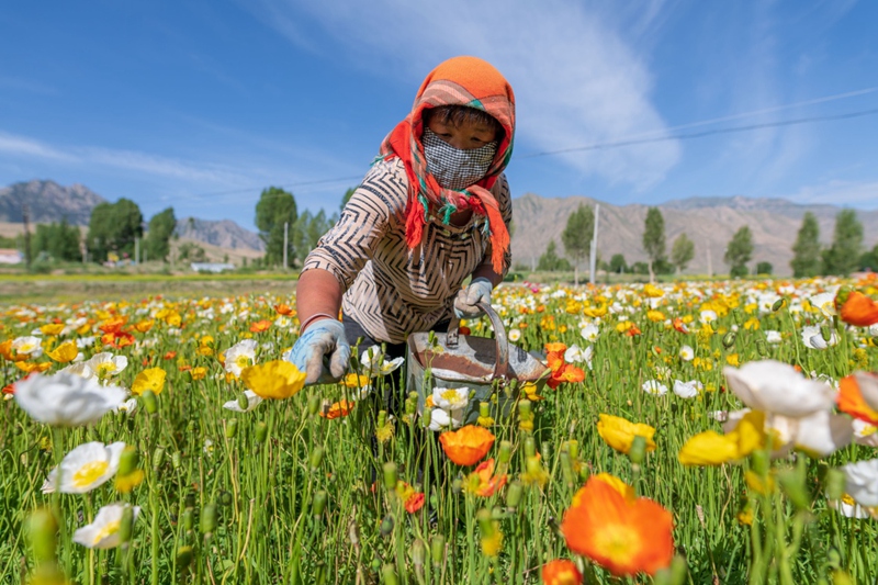 地处祁连山北麓高海拔山区的甘肃省高台县新坝镇红沙河村种植的虞美人缤纷绽放
