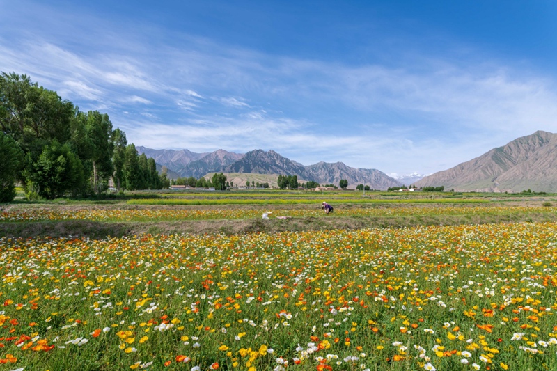 时值盛夏,地处祁连山北麓高海拔山区的甘肃省高台县新坝镇红沙河村种植的虞美人缤纷绽放,形成花海景观。近年来,高台县新坝镇将花卉蔬菜制种作为特色产业来抓,积极引导农户规模化、集中化种植,成为当地农业增效、农民增收的支柱产业之一。